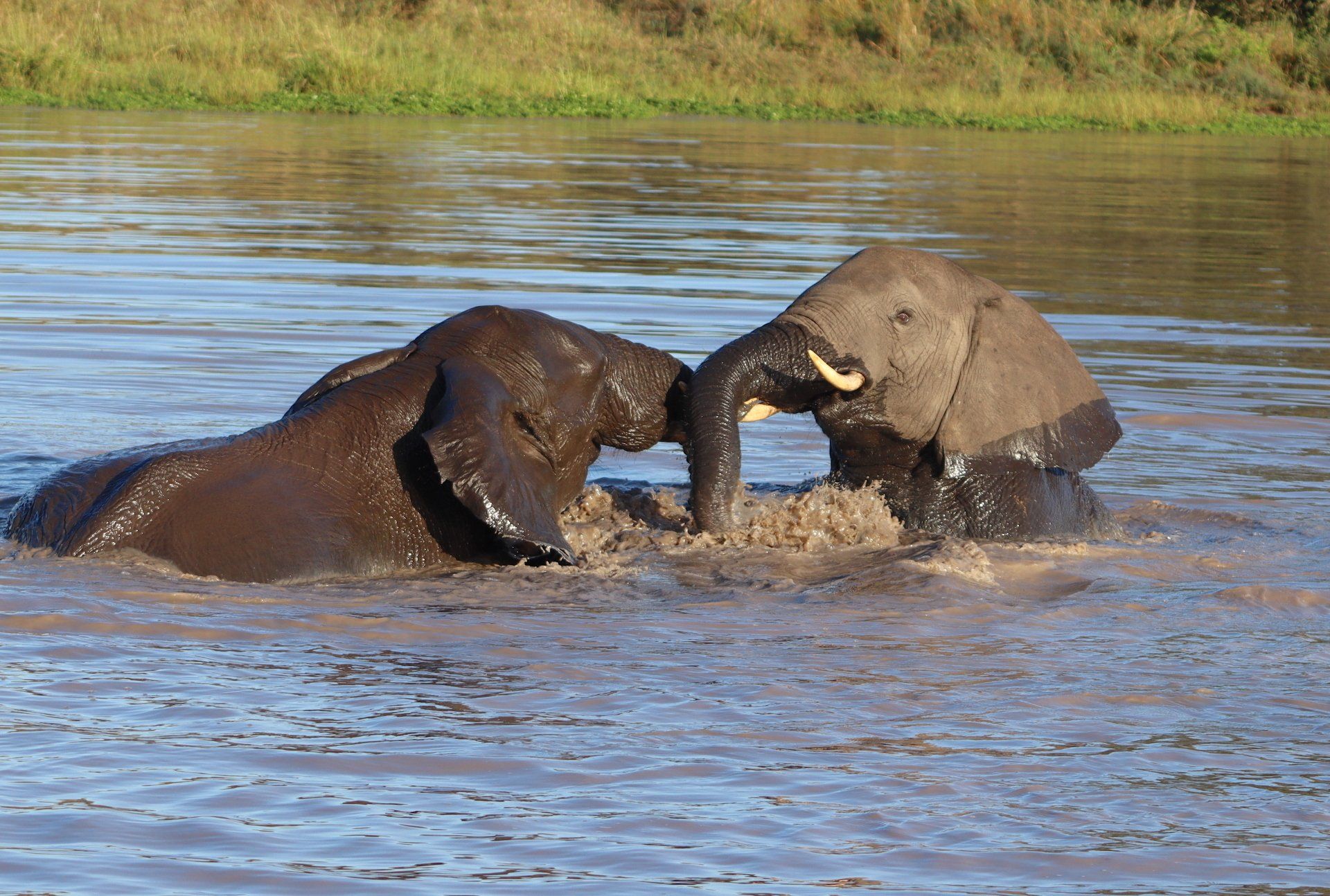 In the dam itself, the bulls were literally having a ball, turning it into their own personal water park as they enjoyed the sport of "who dunked who" and "mud diving", coming up with tusks covered in thick, soggy gray clay. As the excitement mounted, so did the trumpeting, with mock charges and stand-offs in the water leaving Gary and Milly breathless with laughter.