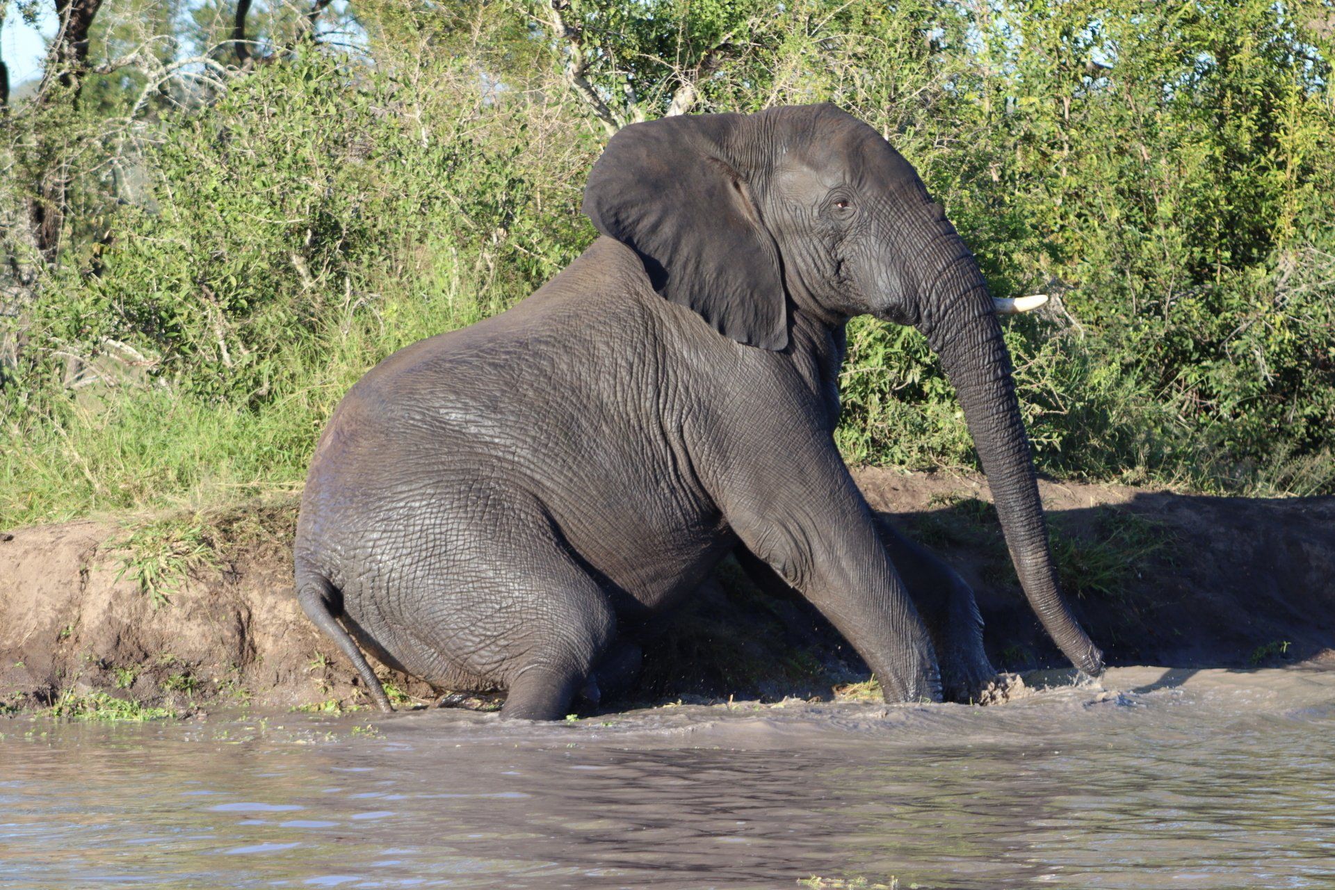 As more and more bulls became involved in the water fight, the elephants continued to emerge from the surrounding treeline and soon the vehicle was surrounded by almost 100 elephants of all sizes. Most chose to drink as quietly and calmly as possible on the banks of the dam, but some selected the dam wall as a good point of entry, even though it seemed very steep for the babies.